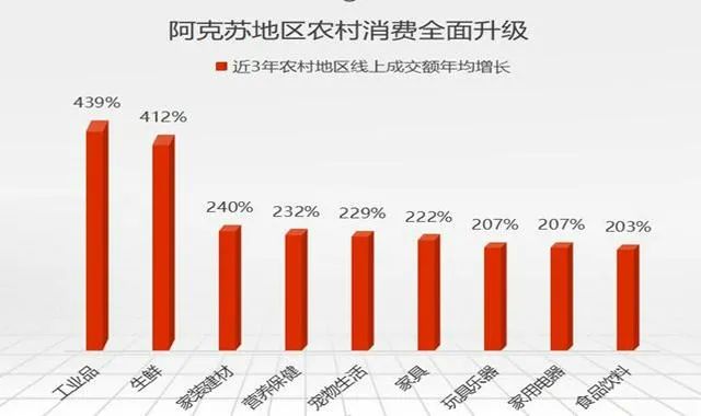 數字經濟助力農村“生產+消費”正循環。當地農產品銷售好的地區,線上消費增長的趨勢也更強。在煙臺、大連、丹東、阿克蘇等暢銷農產品產地,縣域農村地區的消費連年高倍數增長,農村地區網購的成交額增速數倍高于所在城市整體的增速,成為消費增量的重要動力。例如,在阿克蘇農村地區,工業品、家裝建材消費高倍數增長。