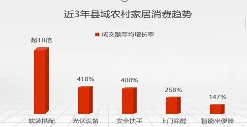隨著農村自建房市場的加快,居民改善型住房需求得到釋放,帶動了家居家裝類商品增長。在房屋裝修、裝飾的花費漲幅巨大,其中軟裝的的年均增長率超10倍。