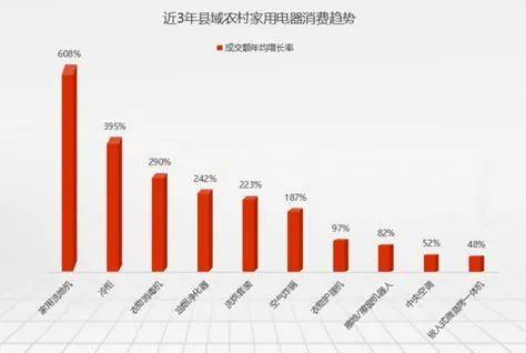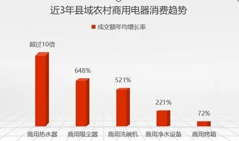 在雙循環新格局之下,進一步加速帶動了縣域農村地區商業用電器的線上消費顯著增長,特別是近三年,農村商業用熱水器、吸塵器、洗碗機等餐飲行業類電器等品類銷售,呈現了2倍、5倍、甚至10倍的增長態勢,這也進一步印證了農村商業的加速繁榮及縣域農村地區人們生活水平及消費實力的提升。