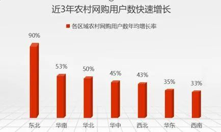 近3年,全國各區域的農村網購用戶數都實現了快速增長,其中東北、華南、華北的增速最為亮眼。
