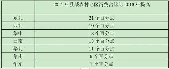 2021年,東北、西北的縣域農村地區消費潛力釋放最快,東北、西北、華中、西南、華北農村網購成交額占比提升超過10個百分點,縣域農村消費在當地的市場份額明顯提升。