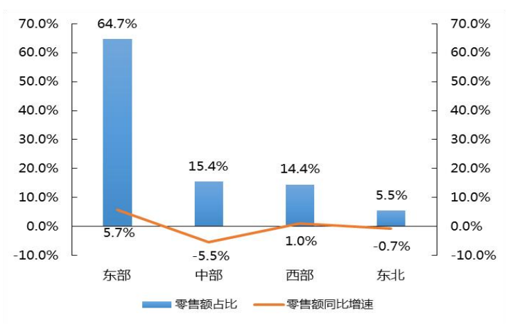 分地區看,東部、 中部、西部和東北地區農產品網絡零售額分別 占全國農產品零售額的 64.7% 、 15.4% 、14.4%和5.5%, 同比增速分別為 5.7%、-5.5%、1%和-0.7%。