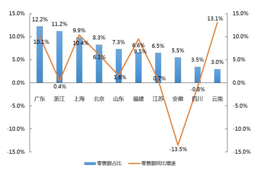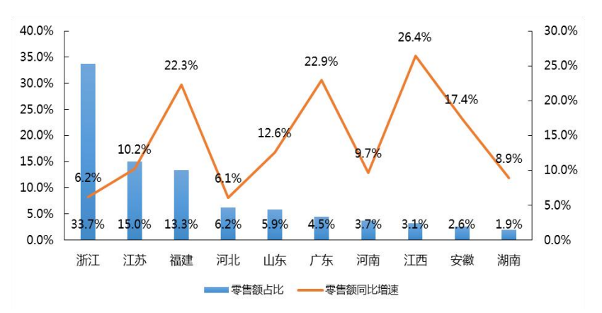 分省份看,浙江、江蘇、福建、河北和山東農村網絡零售額排名前五,合計占全國農村網絡零售額比重為 74.0%,零售額前十位省份合計占比為 89.8%。從增速來看,海南、寧夏、江西、新疆和廣東同比增速位列前五,增速在20%以上。