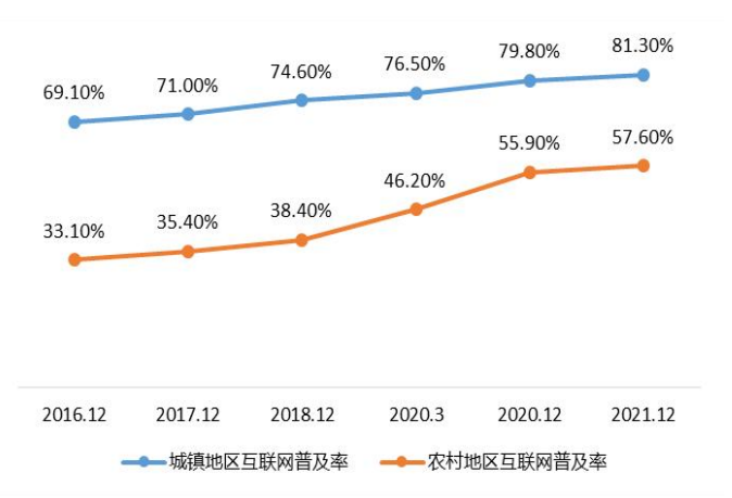 2022年6月,我國現有行政村已全面實現“縣縣通5G、村村通寬帶” 。行政村通光纖比例從不到70%提升至100%,平均下載速率超過100Mb/s,基本實現與城市同網同速。農村地區互聯網普及率進一步提升。據第50次《中國互聯網絡發展狀況統計報告》顯示,2022年6月我國農村網民規模2.93 億。農村地區互聯網普及率為58.8%。
