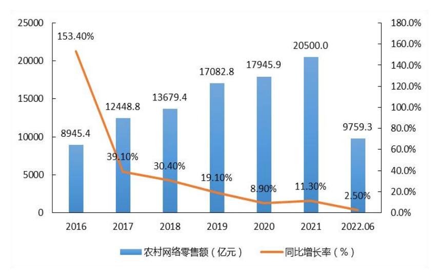 商務大數據監測顯示,2021 年全國農村網絡零售額 2.05萬億元,占全國網絡零售額的 15.66%,同比增長 11.3%。2022年上半年,全國農村網絡零售額9759.3 億元,同比增長2.5%。其中,農村實物商品網絡零售額8904.4 億元,同比增長3.6%。