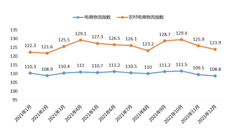 農村物流網絡日益完善,郵政營業網點實現了鄉鎮全覆蓋,建制村全部通郵?!翱爝f進村”比例超過 80%,交快、郵快、快快等合作進一步深化,共同配送、客貨郵融合等新模式不斷涌現。據國家郵政局數據顯示,2021 年農村地區收投快遞包裹總量 370 億件,帶動農產品出村進城和工業品下鄉進村超 1.85 萬億元。2021 年,我國農村電商物流指數保持平穩增長態勢,全年均高于電商物流指數。