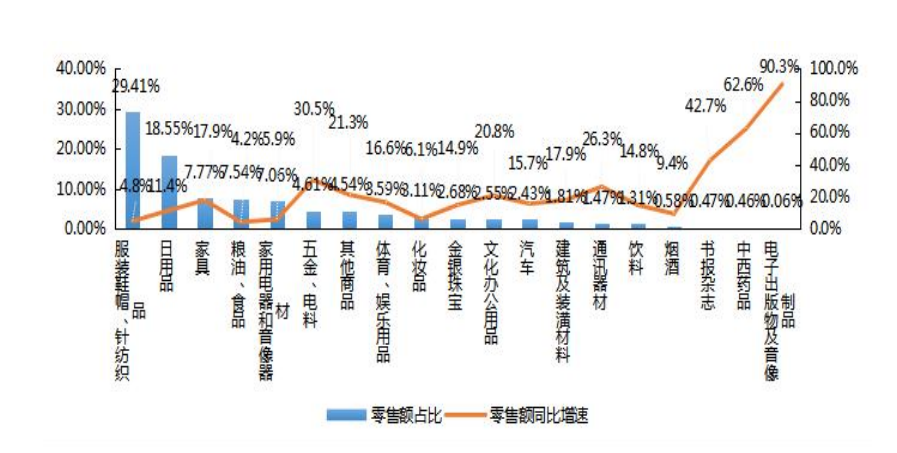 分品類看,零售額前三位的品類分別為服裝鞋帽針紡織品、日用品和家具,分別占農村實物商品 網絡零售額的29.41%、18.55%和 7.77%。增速前三位的品類分別是電子出版物及音像制品、中西藥品、書報雜志, 同比增速分別為90.3%、62.6%和 42.7%。