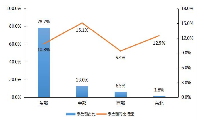 分地區看,東部、 中部、西部和東北地區農村網絡零售額分別占全國農村網絡零售額的 78.7%、13.0%、6.5%和 1.8%,同比增速分別為 10.8%、15.1%、9.4%和 12.5%。