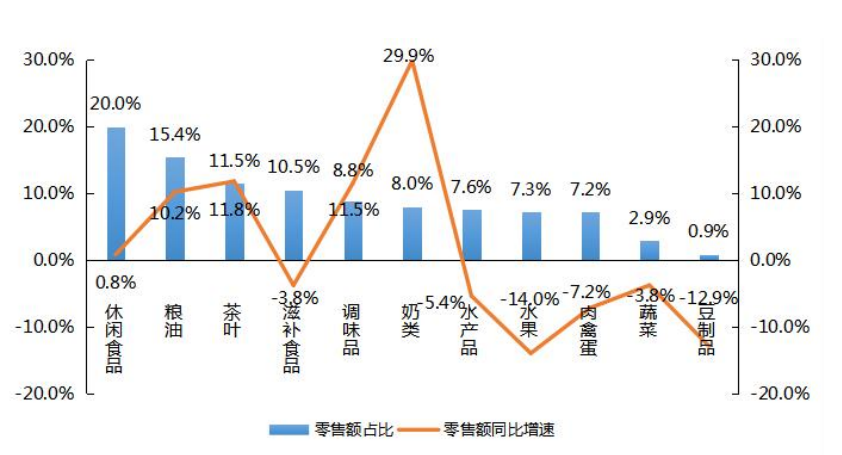 商務大數據監測顯示,2021 年全國農產品網絡零售額4221億元, 同比增長 2.8%。2021 年農產品網絡零售額增速減緩有兩個方面的原因:一是新冠疫情期間線上消費暴增后有所回調。二是部分新平臺、新模式未納入現有統計范疇。分品類看,零售額前三名的品類分別是休閑食品、糧油和茶葉,分別占農產品網絡零售額的 20.0%、15.4%和 11.5%。增速前三位的品類分別是奶類、茶葉和調味品,同比增速分別為 29.9%、11.8%和 11.5%。