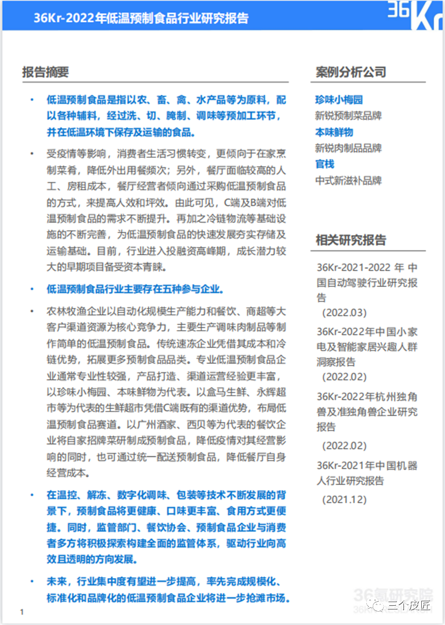 日前,36氪發(fā)布了《2022年低溫預(yù)制食品行業(yè)研究報告》(以下簡稱“報告”),報告主要分為四個部分,第一部分介紹了低溫預(yù)制食品的定義、發(fā)展歷程、發(fā)展動力及行業(yè)資本分析;第二部分主要分析了行業(yè)生態(tài)及市場格局;第三部分重點研究了行業(yè)典型案例;第四部分從技術(shù)應(yīng)用、商業(yè)模式等方面預(yù)測了行業(yè)前景。