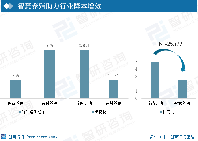 以牧原股份智能養豬場為例,采用數字化智能養豬系統后,有效的降低勞動力、水電等生產成本,商品豬平均每頭可降低25元,商品豬出欄率從85%提高到90%;料肉比由2.6:1提高到2.5:1。