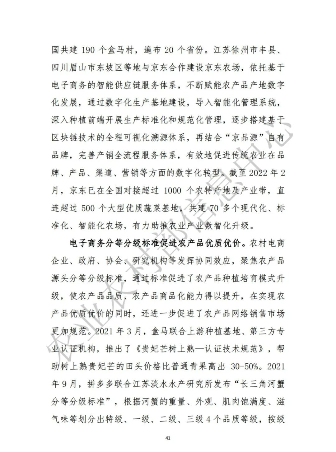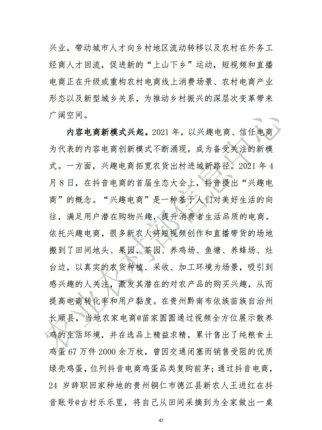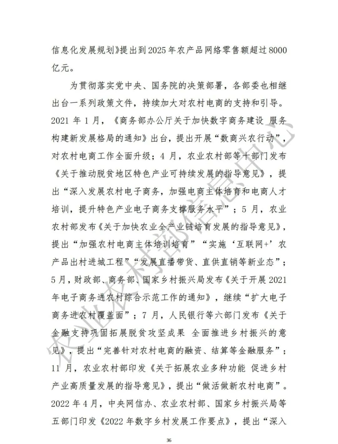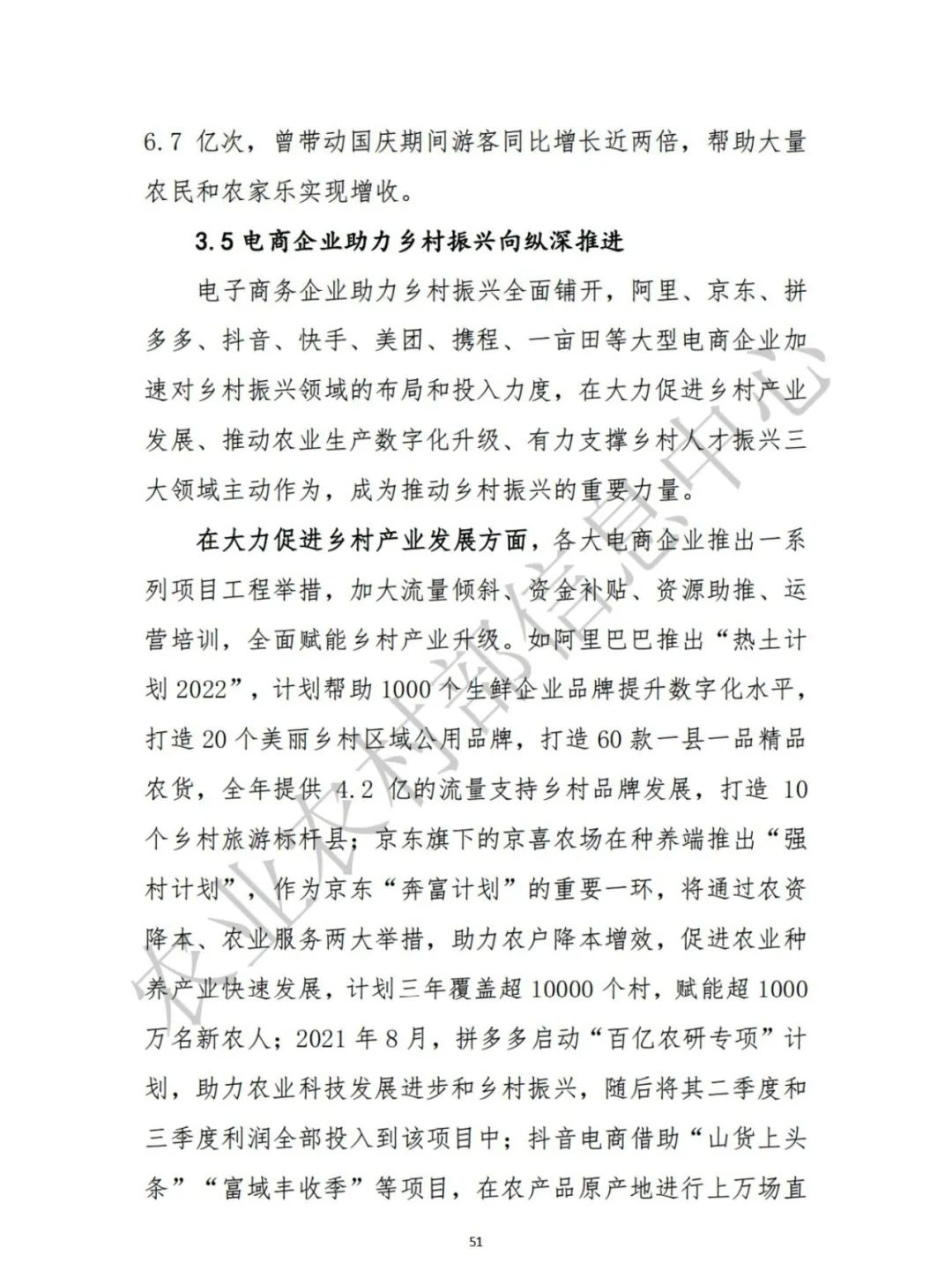 1、農村電商將由消費電商轉向產業電商。電子商務與農業的融合將從初期的銷售端網絡化逐漸向生產端的數字化、智能化邁進,從農產品網絡銷售,到訂單農業、以銷定產、精品網紅農貨開發、區域品牌新農品、農食新消費品牌、預制菜,電子商務將進一步推動農業全產業鏈上下游銜接,促進農產品產銷精準匹配。隨著興趣電商、信任電商、社交電商等內容電商的興起,以農村直播電商、鄉村短視頻、鄉村網紅達人分享等電商應用為先導,還將大大推動鄉村旅游的發展,加速鄉村一二三產業融合的進程。未來,農村電商在服務帶動縣域農業農村經濟高質量發展、促進城鄉共同富裕方面將發揮更重要的作用。