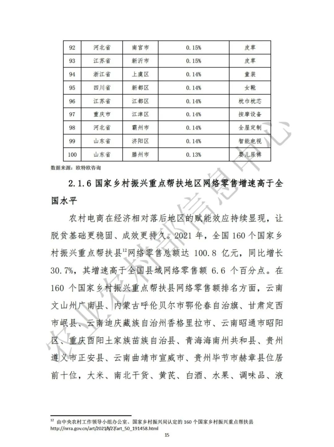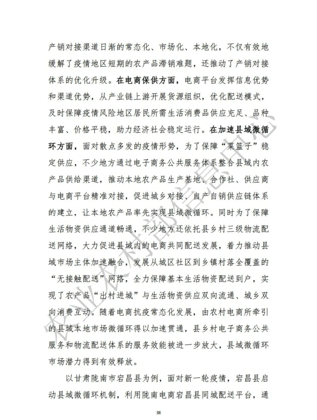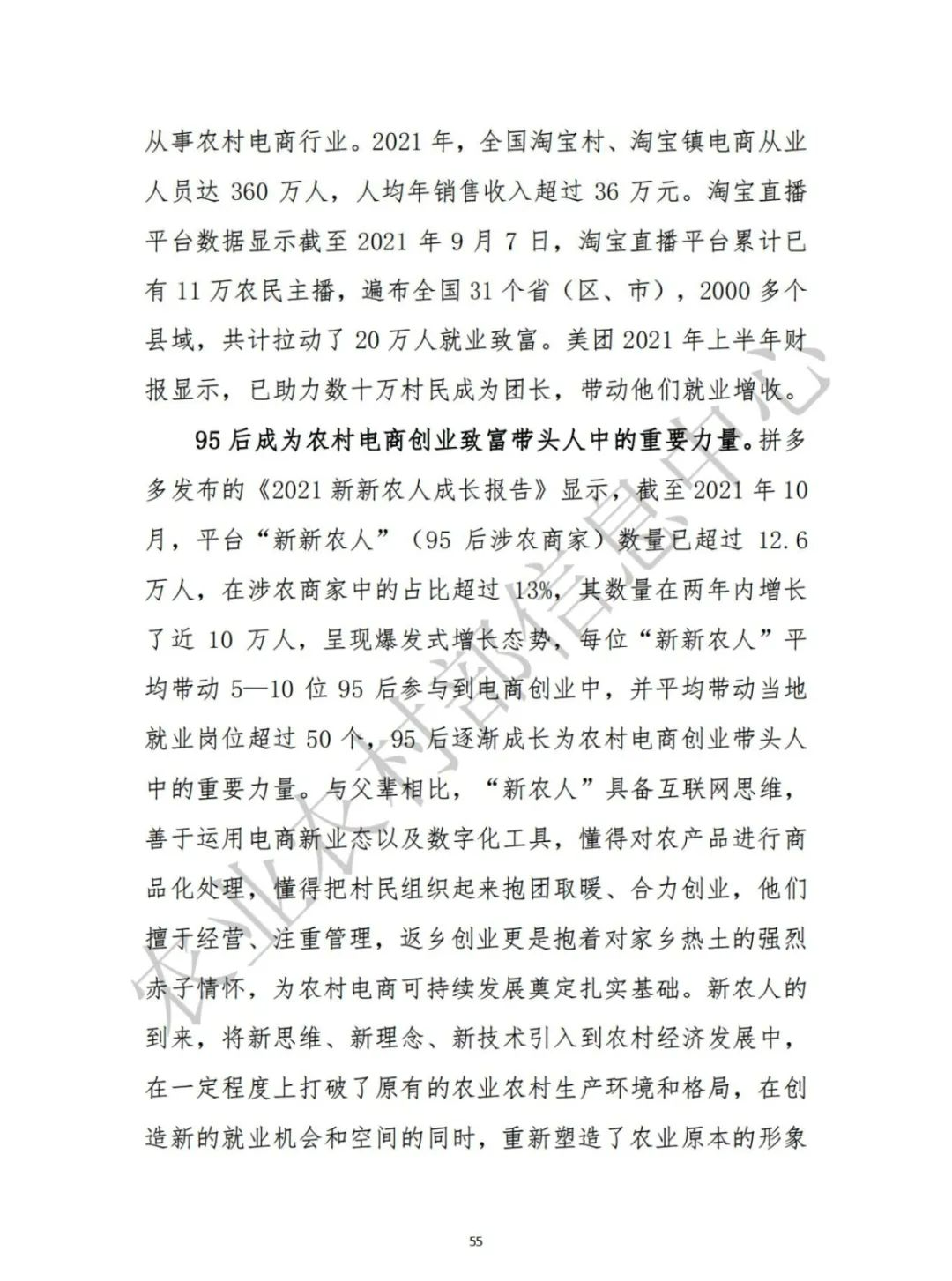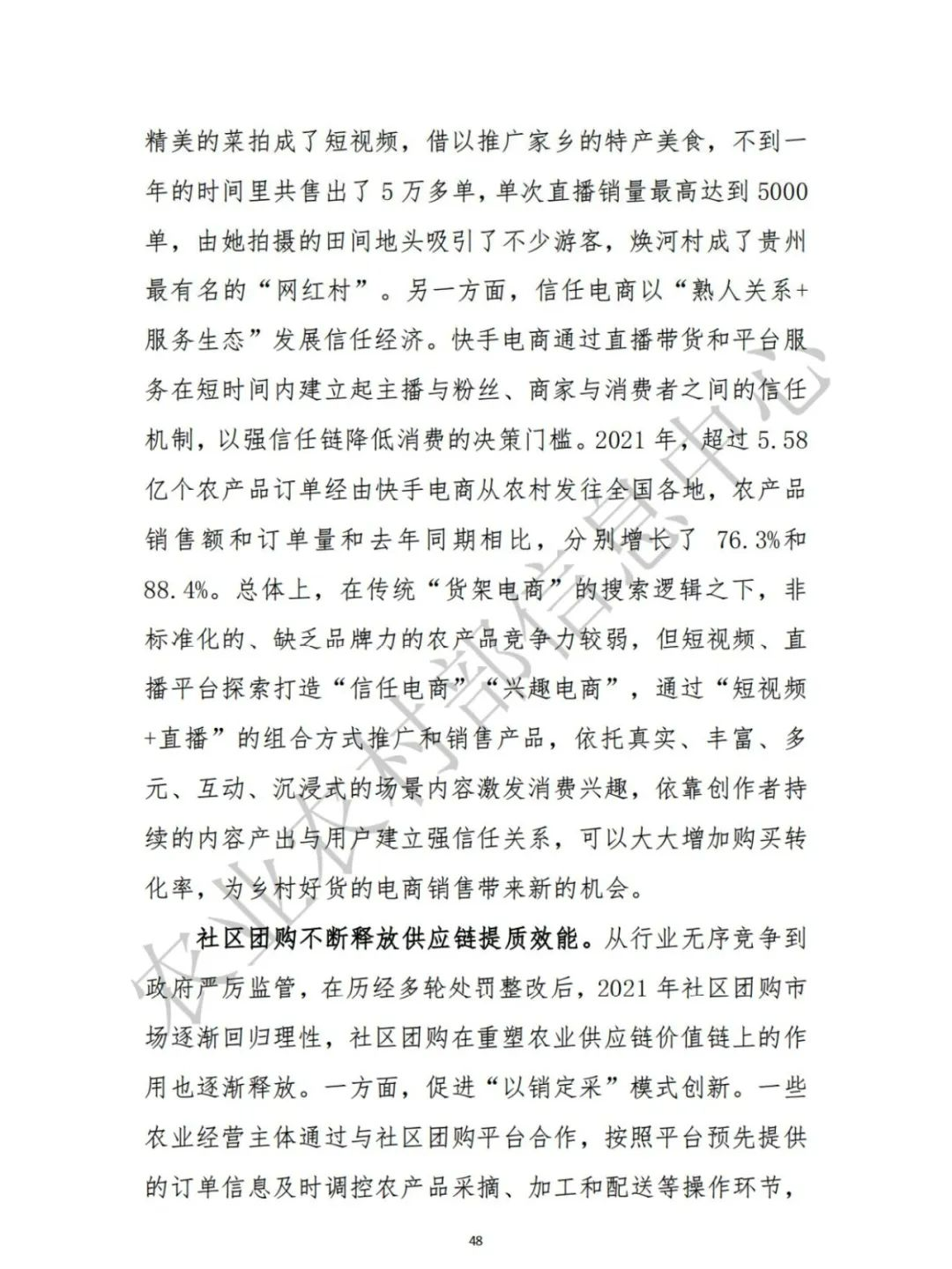1、農村電商將由消費電商轉向產業電商。電子商務與農業的融合將從初期的銷售端網絡化逐漸向生產端的數字化、智能化邁進,從農產品網絡銷售,到訂單農業、以銷定產、精品網紅農貨開發、區域品牌新農品、農食新消費品牌、預制菜,電子商務將進一步推動農業全產業鏈上下游銜接,促進農產品產銷精準匹配。隨著興趣電商、信任電商、社交電商等內容電商的興起,以農村直播電商、鄉村短視頻、鄉村網紅達人分享等電商應用為先導,還將大大推動鄉村旅游的發展,加速鄉村一二三產業融合的進程。未來,農村電商在服務帶動縣域農業農村經濟高質量發展、促進城鄉共同富裕方面將發揮更重要的作用。