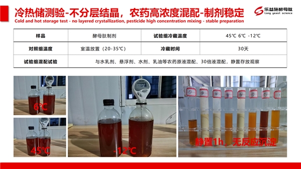 采用自主生產(chǎn)的酵母原料,統(tǒng)一優(yōu)質(zhì)蛋白源,統(tǒng)一標(biāo)準(zhǔn)制品。產(chǎn)品具有良好的水溶性、可吸收性和穩(wěn)定性,在極端高低溫環(huán)境下,能夠保證產(chǎn)品不結(jié)晶不分層。同時(shí)與不同藥劑混配可以穩(wěn)定存在而不發(fā)生反應(yīng)。