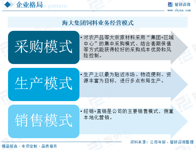 飼料業務是海大集團規模最大的業務,經營管理主要采用原材料集中采購決策、分點生產布局、銷售產品和技術服務緊密結合的經營模式。在飼料采購方面,公司對農產品等大宗原材料采用“集團+區域中心”的集中采購模式、結合套期保值等方式能獲得較好的采購成本優勢和風險控制。生產方面,公司以最為貼近市場、物流便利、資源豐富為目標,進行多點布局生產。銷售模式上,公司采用經銷+直銷的銷售模式,其中主要側重本地化營銷。