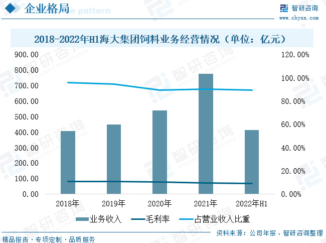 2018-2021年,海大集團飼料業務收入持續增加。2022年,隨著下游養殖規模逐步擴大,及飼料單價上漲。2022年上半年,公司飼料業務收入413.32億元,同比增長22.08%。從毛利率看,受豆粕等主要飼料原料價格上漲影響,海大集團飼料業務綜合毛利率水平持續下降。2022年上半年,公司飼料業務毛利率為9.03%,較2021年下滑0.32個百分點,毛利率降幅收窄。