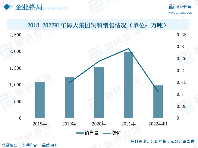 近年來,公司不斷擴大飼料業務規模。2021年公司飼料銷量1963萬噸,約占全國總產量的6.69%%,全國飼料行業第二位。2022年以來,公司進一步加快國內外市場布局,加大與下游行業養殖公司的合作,在行業需求下行的情況下,取得逆勢增長。2022年上半年,公司銷售飼料974萬噸,同比增長11%。
