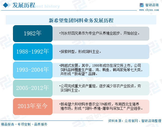 新希望集團是由著名民營企業家劉永好四兄弟在1982年創立,1988-1992年公司探索轉型形成以飼料為核心的發展戰略。1993-2004年,公司實現跨越式發展。其中,1998年成立四川新希望農業股份有限公司(現更名為:新希望六和股份有限公司),并于1998年在深圳證券交易所上市,是新希望集團旗下最大的農牧食品產業板塊。1999年“新希望”首次走出國門,在越南建設第一家海外工廠,公司飼料主業從西南市場擴張到全國、甚至海外市場。隨著企業規模不斷擴大,公司在2002年進入中國企業500強,進一步提高了企業知名度。2005-2012年,公司完成重大資產重組,逐步減少非農產業投資,夯實飼料主業。其中,2011年集團完成重大資產重組,“新希望六和股份有限公司”成為中國最大的農牧上市公司。2013年至今,集團不斷變革創新。2016年新希望六和收購本香農業70%股權,布局西北生豬養殖市場;同年新希望六和投資近3億元人民幣對北京嘉和一品企業管理有限公司的中央廚房進行全資收購,作為在食品端的又一重大布局,加強在食品加工環節的競爭力,形成“飼料-養殖-屠宰與深加工”產業鏈條。