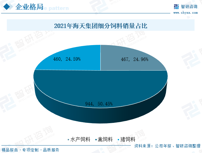 公司飼料產品主要包括水產飼料、禽飼料和豬飼料等,從對外銷售數據看,2021年公司禽類飼料對外銷量為944萬噸,占對外總銷量的50.45%;水產飼料對外銷量467萬噸,占比為24.96%;豬飼料對外銷量460萬噸,占比為24.59%。