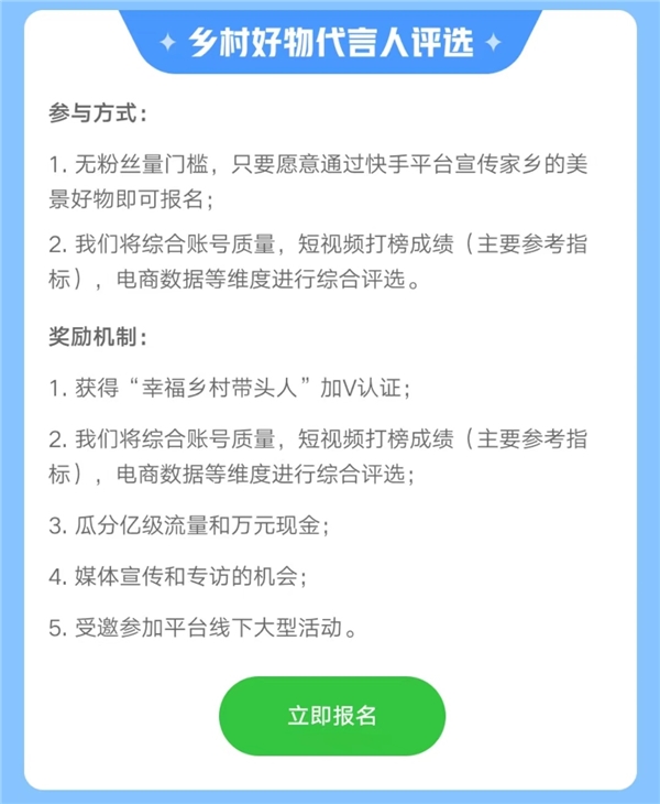 同時,“鄉村好物代言人”評選通道也已開啟。為引入更多“三農”創作者,評選不設粉絲量門檻,愿意通過快手宣傳家鄉美景好物即可報名。官方將以打榜成績為主要參考指標,并綜合賬號質量、電商數據等維度,給予優勝者“幸福鄉村帶頭人”加V認證。獲得“鄉村好物代言人”稱號的創作者可瓜分億級流量和萬元現金,有機會參與平臺組織的線下大型活動。