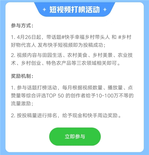 即日起,用戶帶話題#快手幸福鄉村帶頭人和#鄉村好物代言人,發布田園生活、農村美食、鄉村美景、農業技術、鄉村創業、特色農產品等“三農”領域相關的快手短視頻,即可參與打榜活動。官方每月將根據視頻數量、播放量、點贊量等情況,綜合評選TOP50創作者,給予10-100萬不等的流量激勵。此外,將按投稿量進行排名,給予現金和快手周邊等獎勵。