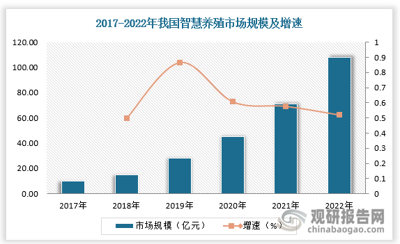 我國(guó)智慧養(yǎng)殖行業(yè)市場(chǎng)規(guī)模也持續(xù)增長(zhǎng)。數(shù)據(jù)顯示,2017-2021年我國(guó)智慧養(yǎng)殖行業(yè)市場(chǎng)規(guī)模由10億元左右增長(zhǎng)至71億元。2022年我國(guó)智慧養(yǎng)殖行業(yè)市場(chǎng)規(guī)模突破100億元,達(dá)108億元。
