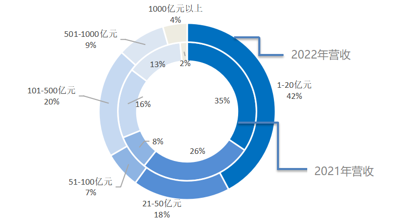 2022年的企業營收數據與2021年相似,50億元營收以內的企業占比約六成;100億元以上的企業僅占比三成多,其中100-500億元的企業占比相較2021年有所增加,達20%,500億元以上的企業仍較少,僅有13%。