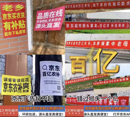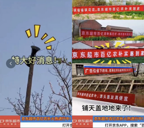 短片上線前,京東超市先一步在全國多個鄉(xiāng)村打造了一場線下刷墻事件,把“京東超市百億農(nóng)補,源頭直發(fā)真便宜”的口號直接打到了老鄉(xiāng)的家門口,吸引互聯(lián)網(wǎng)營銷號圍繞“京東超市百億農(nóng)補把廣告打到村里了”,將散落在田間地頭的土味宣傳語,混剪成魔性、洗腦的土味宣傳視頻。