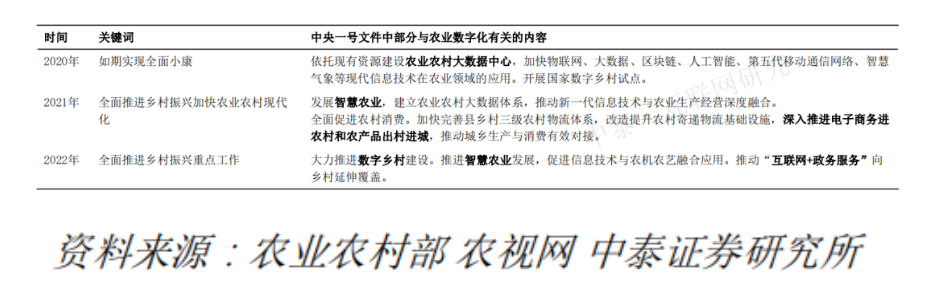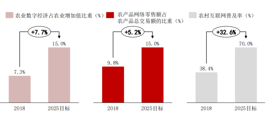 國家針對農業數字化發展制定了目標與時間線,農業數字化的發展前景明確。《數字農業農村發展規劃(2019-2025年)》,對農業數字經濟、農產品網絡零售、農村互聯網普三項工作的發展提出2025年指標。