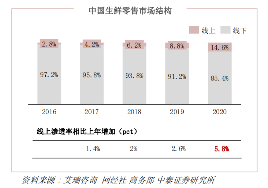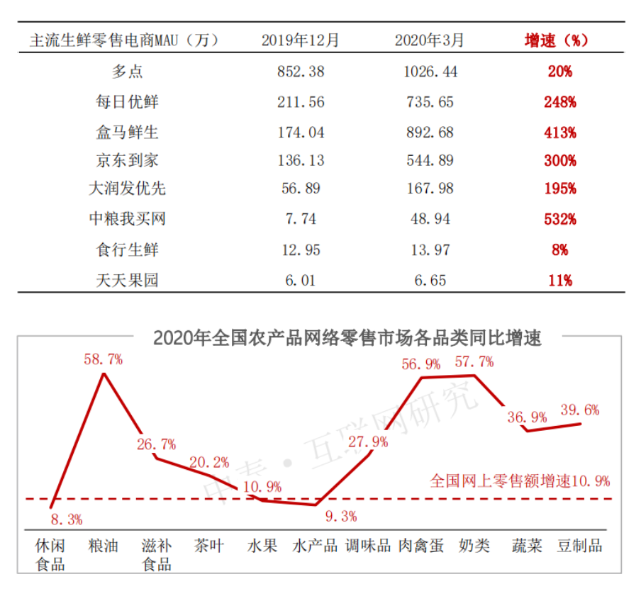 疫情爆發期間,主流生鮮零售電商MAU實現超高速增長,農產品上行加速。疫情期間,居民因居家隔離等原因,線上購買生鮮農產品的需求大大增加,2020年Q1,很多生鮮電商平臺MAU實現數倍增長。2020年全年,生鮮零售線上比例為14.6%,比2019年增加近6pct。農產品上行速度加快,糧油、肉禽蛋、奶類、蔬菜和豆制品五類農產品網絡零售額同比增速均超過30%,遠高于全國網上零售額增速10.9%。