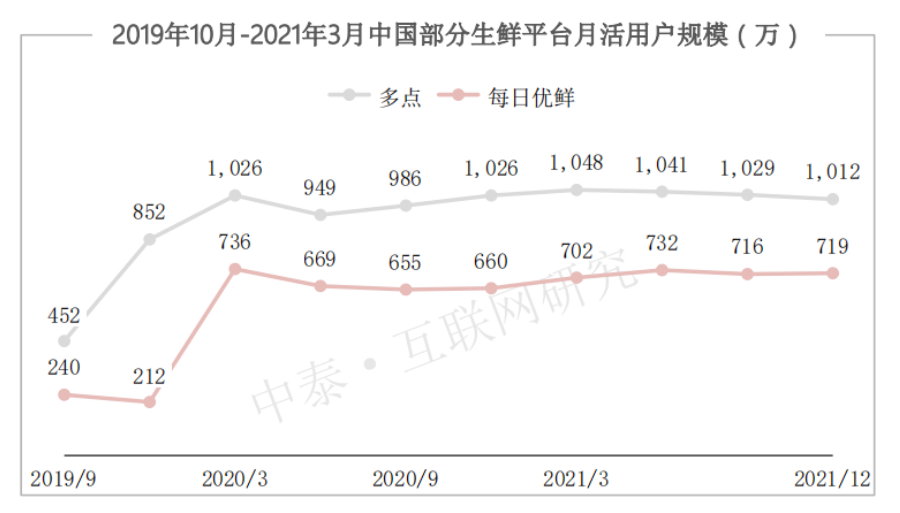 消費者在疫情期間培養的線上購買生鮮農產品的習慣在疫情減緩之后仍得到保持,購買生鮮的頻次以及主流生鮮平臺月活用戶數基本與疫情爆發期持平。根據艾瑞咨詢的調研,疫情前,生鮮電商用戶在APP購買生鮮頻次高于每周一次的占比約57.3%,疫情期間為69.1%,疫情后為67.2%。雖然疫情后頻次略有下降,但仍遠高于疫情前。而以多點和每日優鮮為例,2020年Q1月活用戶數大幅增長,Q2略有降低但之后逐漸恢復平穩增長。說明消費者線上購買生鮮農產品的習慣已經得到培養。