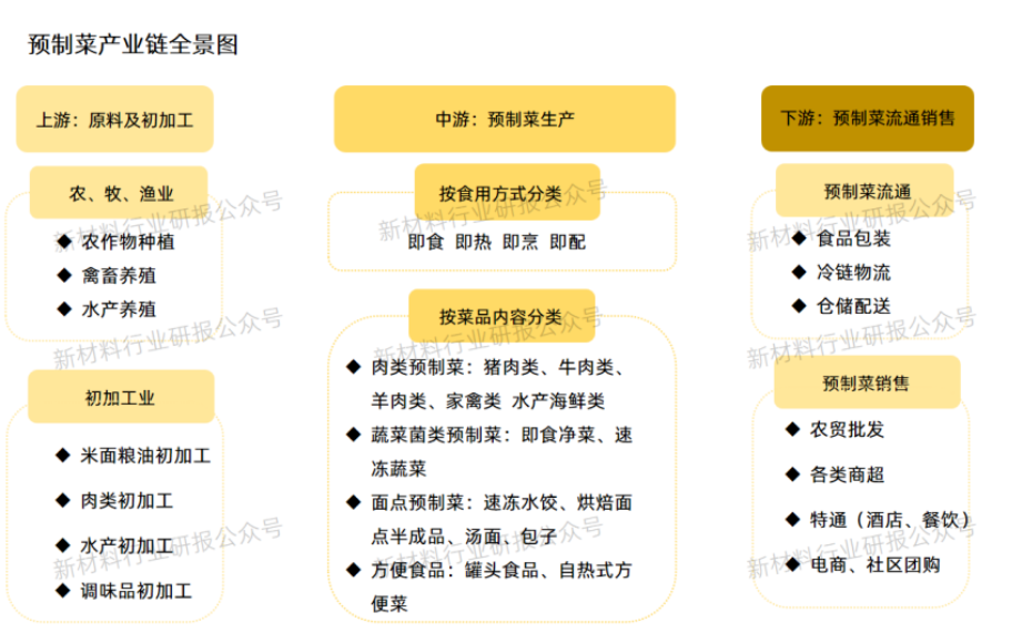 預制菜產業鏈由上中下游三部分組成。上游為原料及初加工,包括農、牧、漁業、初加工業等,中游為預制菜生產,包括即食、即熱、蔬菜菌類預制菜、面點預制菜等,下游為預制菜流通銷售,包括預制菜流通、預制菜銷售等。