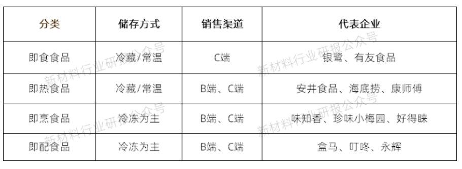 按照加工程度以及原輔料來劃分,預制菜可以分為即食食品、即配食品、即烹食品以及即熱食品。即食食品指開封后可以直接食用的調理制品。即配食品為經過清洗、切配加工,但未經過調味腌制的蔬菜、肉禽等產品。即烹食品為經過調味、裹粉、預炸等工序的半成品。即熱食品為經過調味、腌制的菜品進一步炒制、蒸煮后的熟制品,再以速凍的方式保存。