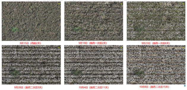 在此基礎上開展不同畝用水量、不同施藥次數、不同藥劑和助劑對脫葉效果影響試驗,共計60項試驗處理。在9月17和9月23日先后進行了兩次植保無人飛機施藥,根據施藥時間進行了四次棉花脫葉和吐絮效果調查。