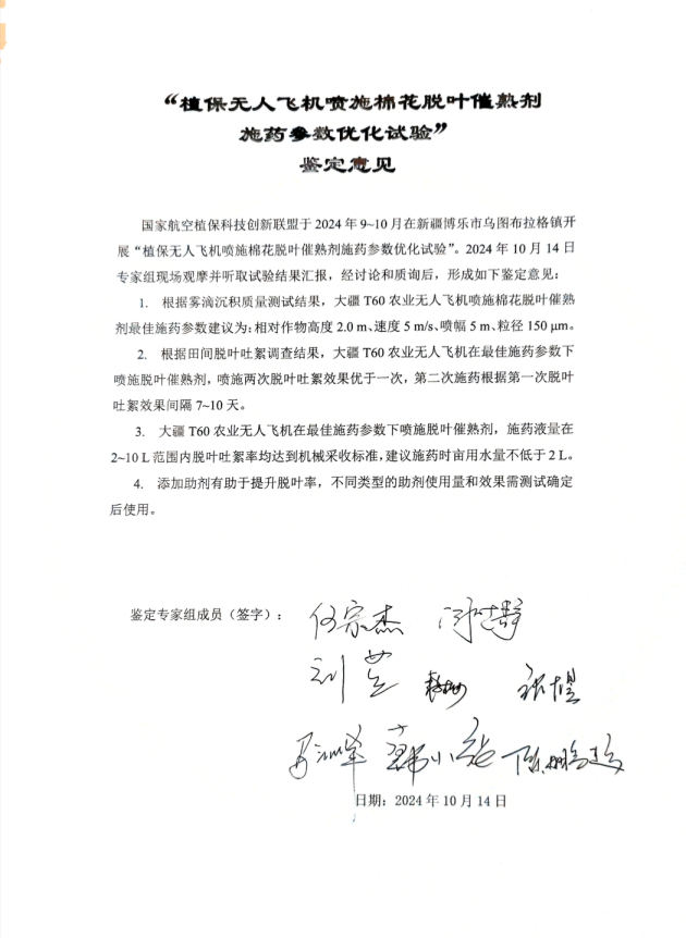 (2024.10.14,新疆)10月14日,國家航空植保科技創新聯盟在新疆博樂市烏圖布拉格鎮塔特勒根村開展“植保無人飛機噴施脫葉催熟劑效果評價聯合試驗”現場評價會。在現場展示了用植保無人機進行棉花劑噴灑的最終效果,通過現場的數據展示,植保無人機在最佳施藥參數下,棉花脫葉率可達90%以上。