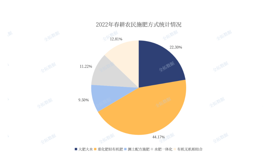 當(dāng)前,我國既是肥料的生產(chǎn)大國也是使用大國,我國化肥總產(chǎn)量和消費(fèi)量均占世界33%以上。依據(jù)2022年的春耕情況,數(shù)據(jù)顯示,農(nóng)民施肥依然以重化肥輕有機(jī)肥為主,占比高達(dá)44.17%,但測(cè)土配方施肥(9.5%)、水肥一體(11.22%)、有機(jī)無機(jī)相結(jié)合(12.81%)的比重有逐步攀升,說明近年來隨著“藏糧于地、藏糧于技”國家戰(zhàn)略舉措的不斷實(shí)施和落地,我國新型肥料的使用已經(jīng)得到響應(yīng)普及,農(nóng)業(yè)生產(chǎn)方式和習(xí)慣發(fā)生了很大變化,人們的科學(xué)種地和養(yǎng)地的意識(shí)逐步增強(qiáng)。