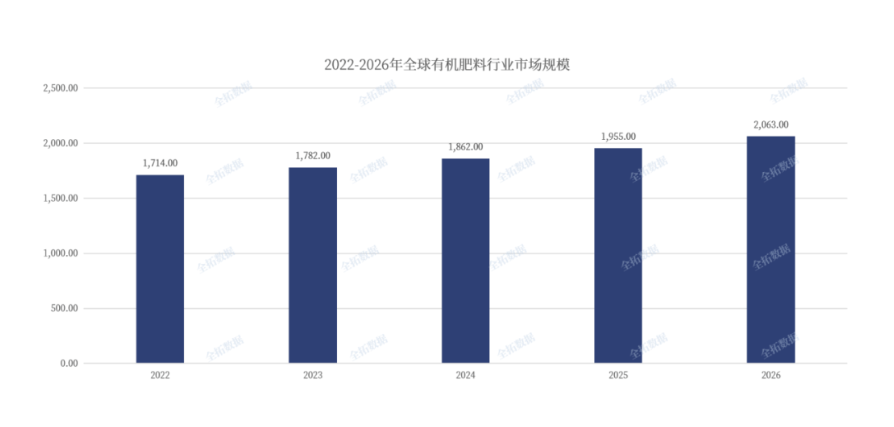 世界上很多國家,尤其是發(fā)達(dá)國家都制定、實(shí)施了有機(jī)肥資源管理政策。美國的許多地區(qū)在農(nóng)業(yè)生產(chǎn)中積極開展諸如無害化有機(jī)肥、測(cè)土施肥等保護(hù)性耕作的研究。不同于我國實(shí)際使用有機(jī)肥占比不足20%的情況,西方國家有機(jī)肥料用量已占肥料使用總量的50%左右。數(shù)據(jù)顯示,2022年全球有機(jī)肥市場(chǎng)規(guī)模已增至1714億美元,并且隨著行業(yè)進(jìn)一步發(fā)展與產(chǎn)品普及,預(yù)計(jì)2026年全球有機(jī)肥市場(chǎng)規(guī)模將達(dá)到2063億美元。