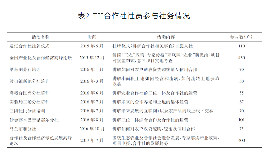 在生產合作方面,TH合作社以技術為先導,全面提升全社農業生產經營水平。合作社及其分社覆蓋的可耕種土地約50萬畝,從事種植農戶11000余戶。合作社以生產指導和統購農資為主,在種植和養殖的過程中為農民提供定期培訓指導和科學調整種植結構兩個方面的服務。合作社重視社員參與社內事務,除了每季度安排的例會,還在社內成立“TH三農學堂”定期為社內農牧民提供生產指導。例如,為了進一步提高種植技術、改進種植條件,合作社聘請專業的瓜果種植專家進行實地考察,通過“瓜農學堂”向當地瓜農社員免費傳授改進生產技術的經驗。合作社通過全程種植技術指導來進行規范化的管理,在申請綠色食品基地認證、良好農業規范認證和出口蔬菜備案基地認證過程中來進一步規范蜜瓜種植的標準化行為。在合作社成立之初,為了幫助社員更好地了解合作社的生產運營,合作社還組織社員多次參加各種培訓和論壇,使合作的思想和理念深入人心。2015—2017年社員參與社務的情況如表2所示。