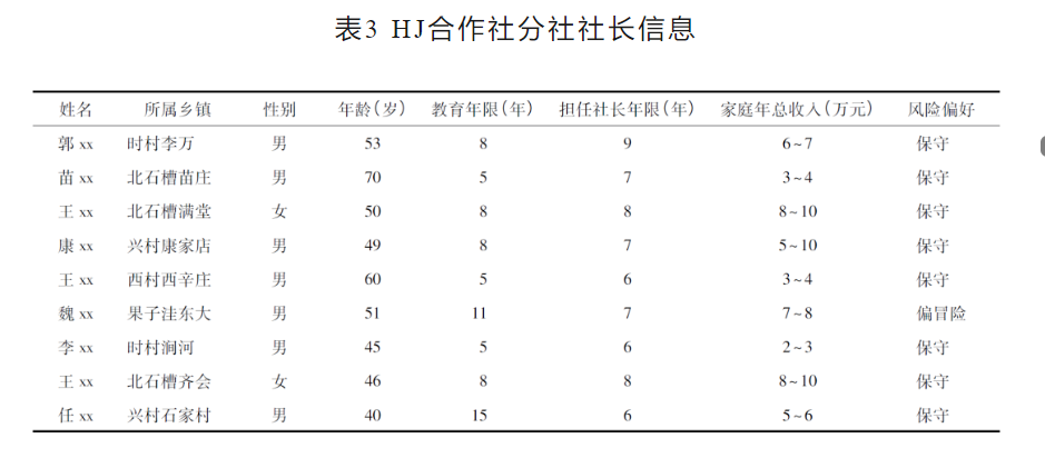 根據表3中對HJ合作社分社社長的訪談可以發現,大部分分社長為50歲以上、教育程度為初中水平的中老年農民,擔任社長年限大多在6~8年,自己和家人都有向合作社申請貸款的經歷,70%的分社長過去還曾在農信社中擔任過各村的業務代辦員,對本村農戶信用狀況、貸款流程比較了解。分社是否同意為某社員提供貸款主要依靠各分社長的個人經驗判斷,如果分社長判斷失誤將給整個合作社帶來信貸風險。根據調研來看,目前大部分分社社長都具有保守型的風險偏好。這雖然使得合作社在開展信貸業務時偏向保守穩健,但也會遏制一部分農戶的正當需求,限制了信用合作的長期發展。除此之外,個別社長年齡偏大,如果沒有合適的有經驗的接班人,將直接影響分社的業務開展。其次,合作社并非專業的小額貸款機構,缺乏專業人員履行財務職能。《農民專業合作社財務會計制度》中要求合作社要建立總賬、明細賬、現金日記賬和銀行存款日記賬。HJ合作社與社員之間開展信用合作,理應對信用合作業務進行單獨核算,建立健全內部管理制度,便于資信調查和貸款監管。但實際操作上卻缺乏統一、規范的賬目,每個分社也沒有全部配置相關財務人員,難以進行財務監督。再次,當地監管機構為了加強風險防控,一直沒有完全放開農民專業合作社開展信用合作,一旦有金融市場波動或被鑒定為不合規經營,其業務很容易被監管部門取締,因此信用合作社面臨較大的政策風險和法律風險。也正因如此,HJ合作社從2015年開始嚴格控制自身的經營規模和經營區域,信用合作規模基本沒有很大增長。以楊理事長為代表的HJ合作社主要領導表示,非常希望能夠找到某個合適的農業產業,以產業經營為依托開展生產、供銷、信用“三位一體”的綜合合作,通過生產、供銷的經營場景積累農戶生產、銷售等綜合信息和數據,發揮場景金融的優勢為社員信貸提供信貸依據并更好地進行風險防控。
