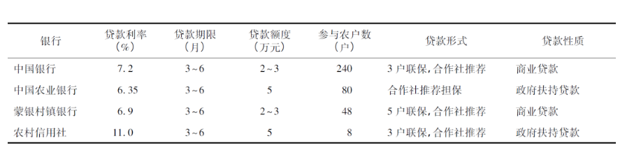 相比較而言,TH合作社在開展信用合作業務過程中,以生產合作和供銷合作等日常經營活動中所積累的社員信息和信貸需求為依據,由FX金融科技公司提供技術支持建立農戶家庭信用評估模型,為信用社開展內部信用合作提供信貸依據。該模型的建立和運用改變了完全靠社長或分社社長人為主觀判斷來做出信貸決策的狀況,減少了信貸的不確定性,在一定程度上防范了信貸風險。截至2019年底,TH合作社利用該模型和互助資金共累計發放貸款約80萬元,單戶貸款規模約2~3萬元,貸款年化利率約9.72%,緩解了部分社員的貸款難題。與此同時,合作社引入了“合作社+銀行+農戶”模式,通過與當地商業金融機構建立合作關系,為農民提供低利率的貸款,幫助農戶解決貸款難的問題。截至目前,TH合作社與蒙銀村鎮銀行合作共為48戶農牧民發放貸款230余萬元,與中國農業銀行和中國銀行合作為300多戶農牧戶提供了貸款。具體的貸款情況見表4。