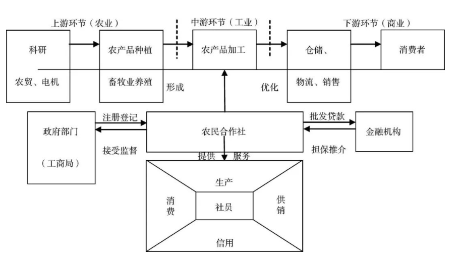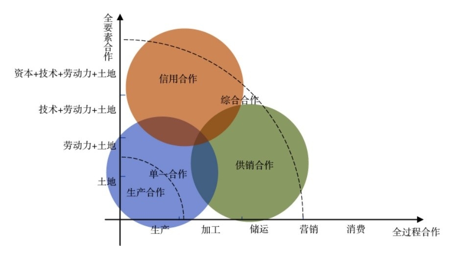 一方面,全過程合作意味著農產品生產、加工、儲運、營銷、消費等諸多環節內的橫向合作與環節之間縱向合作的結合。前者是全過程合作的基礎,即每個環節上的同類主體或具有一定專業化分工的同業主體的合作,常意味著產業經濟的橫向規模。后者是全過程合作的表現,即產業鏈上下游各環節之間按照市場原則進行的交易性合作,常意味著產業經濟的縱向深度,并決定著產業整體經濟規模。“三位一體”綜合合作是從生產領域的單一合作延伸到產業鏈后端直至消費環節的合作形式。