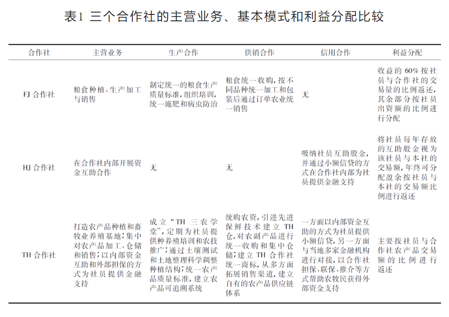 以上三個合作社的主營業務、基本模式和利益分配如表1所示。