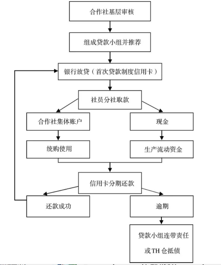 其次,由于合作社成立時間較短,為了彌補在開展信用合作時自身實力有限的不足,合作社引入“合作社+銀行+農戶”模式,積極與涉農商業銀行合作,為農民提供低利率的貸款,解決單個農戶貸款難的問題。為了防范風險,在開展具體業務時,合作社分社負責對申請貸款社員的土地、戶口、貸款需求、貸款用途以及家庭經營情況等進行詳細調查,然后篩選出符合貸款標準的社員,在自愿的基礎上由每3位社員組成一個貸款小組,再將這些信息打包提交至銀行。銀行通過審批為每位貸款戶主制作一個“福農信用卡”,信用卡的額度便是放貸金額。農戶收到貸款發放信息后,直接攜帶社員證去分社領取“福農卡”,并在POS機刷卡,卡內資金的70%會轉入合作社集體賬戶,在以后統購化肥、種子等農資時扣除,剩余30%以現金形式發放給社員,用于生產性消費。農戶以分期還款的方式歸還貸款。如果出現逾期,貸款小組的其余農戶和合作社都將承擔連帶責任。在與金融機構的合作中,通過合作社前期篩選、農戶小組聯保和分期還款,有效降低了銀行的信用風險,合作社集體賬戶的劃撥也在一定程度上降低了貸款戶的道德風險,保證貸款資金用于生產。TH合作社合作金融的擔保、推介和風控流程見圖4。