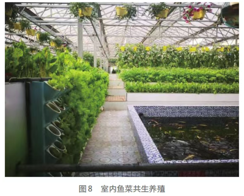 室內魚菜共生是在蔬菜大棚中建設魚菜共作模式(見圖8)。設施養魚區建設養魚系統養殖名優水產品并對水體凈化循環,蔬菜種植區進行土基蔬菜和水培蔬菜種植。養殖尾水過濾后形成高濃度液肥和低濃度水體兩部分,高濃度液肥發酵后作為蔬菜的有機肥,低濃度水體中營養元素被吸收利用及有害物質被分解后循環再養魚。