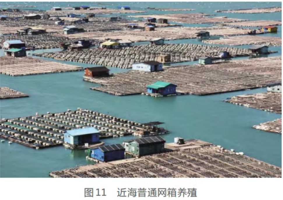 近海普通網箱養殖是指在自然海灣鋪設網箱進行集約化養殖的一種模式(見圖11),具有網箱體積小,投資少、見效快、技術要求低,可養殖種類多,易普及推廣等優點。且它離海岸近,往往在天然避風港灣,受臺風等自然災害的影響小,投資風險較低,容易被養殖者接受。