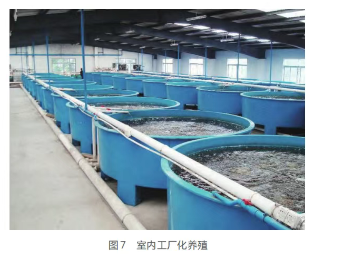 室內工廠化循環水養殖是以循環水養殖系統為核心裝置(見圖7),開展集約化生產的一種養殖模式,具有養殖設施設備先進、管理高效、養殖環境可控、養殖生產不受地域空間限制、養殖產量高、可保障產品質量安全和均衡上市,以及社會、經濟和生態效益良好等特點,是現代水產養殖業的主要發展方向。