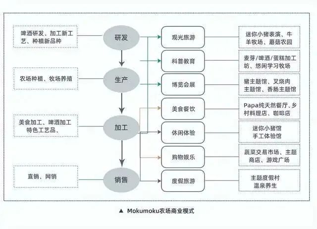 Mokumoku農(nóng)場(chǎng)以第一產(chǎn)業(yè)(伊賀豬養(yǎng)殖、農(nóng)作物種植)為核心,圍繞第一產(chǎn)業(yè)進(jìn)行二產(chǎn)加工(各種豬肉制品和各色餐飲美食、精釀啤酒、各種手工藝品等),形成三產(chǎn)(觀光旅游、活動(dòng)體驗(yàn))項(xiàng)目,并且每條產(chǎn)業(yè)鏈間既獨(dú)立完整,又相互融合,環(huán)環(huán)相關(guān)。