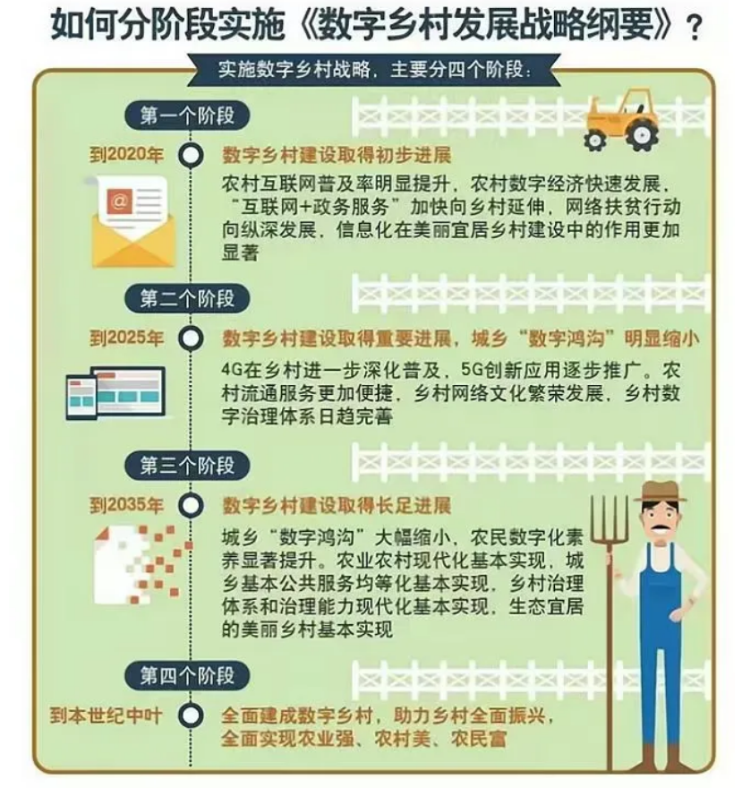 前言:2019年,中共中央辦公廳、國務(wù)院辦公廳聯(lián)合印發(fā)《數(shù)字鄉(xiāng)村發(fā)展戰(zhàn)略綱要》,制定了我國數(shù)字鄉(xiāng)村建設(shè)的中長期發(fā)展目標,明確到2020年,數(shù)字鄉(xiāng)村建設(shè)取得初步進展;到2025年,數(shù)字鄉(xiāng)村建設(shè)取得重要進展;到2035年,數(shù)字鄉(xiāng)村建設(shè)取得長足進展;到本世紀中葉,全面建成數(shù)字鄉(xiāng)村,助力鄉(xiāng)村全面振興,全面實現(xiàn)農(nóng)業(yè)強、農(nóng)村美、農(nóng)民富。