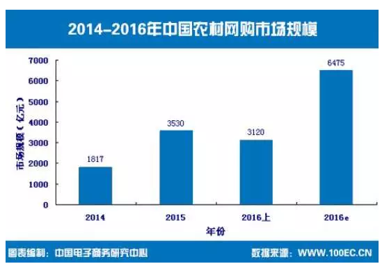 說起農村電商,是這兩年很熱的一個詞兒,各地政府都在大力發展農村電商。據國內知名互聯網+智庫中國電子商務研究中心(100EC.CN)監測數據顯示,2014年全國農村網購市場規模達1817億元,2015年農村網購市場規模達3530億元,同比增長94.3%。2016年上半年農村網購市場規模達3120億元,到2016年達6475億元。