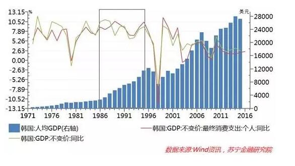 日本人均GDP在1972年達(dá)到3000美元左右,1974年跨過(guò)4000美元,1976年進(jìn)一步跨過(guò)5000美元,在此期間(1972-1976年)日本消費(fèi)年均增速為17.3%,為日本消費(fèi)增長(zhǎng)最快的階段。